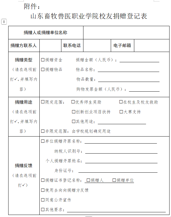 附件:山东畜牧兽医职业学院校友捐赠登记表