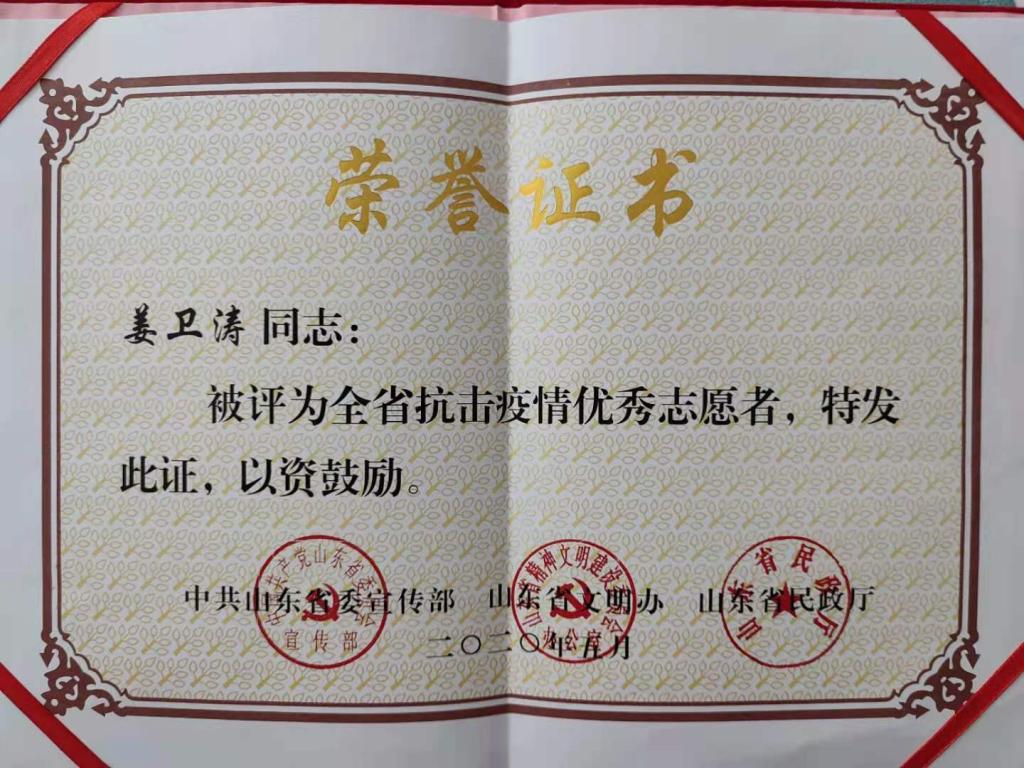 2020年,新冠疫情发生后,姜卫涛不惧危险、下沉一线,多次带领志愿者到陵城区东关社区、糜镇祥龙集中医学隔离点帮助疫情防控,做好卡点值守、人员摸排、防疫消杀和防控宣传等工作,为抗疫胜利做出重大贡献。2020年5月,被山东省委宣传部、省文明办、省民政厅评为“全省抗击疫情优秀志愿者”。
