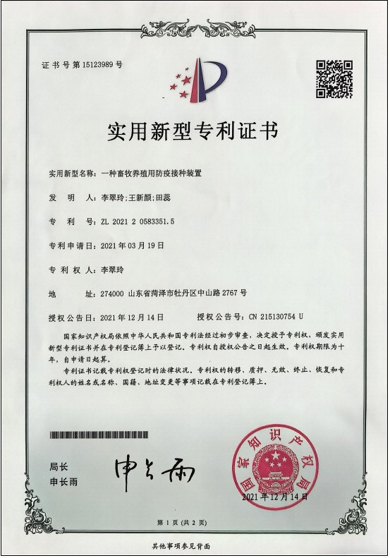 李翠玲,1995年畜牧兽医专业毕业,菏泽市动物疫病预防控制中心科长,发明一种畜牧养殖用防疫接种装置,通过拦挡机构可实现快速对多个牲畜进行接种,节省接种时间;利用固定机构便于固定牲畜,提高了固定牲畜的便利程度;借助辅助支撑机构可提高接种管的稳定性。