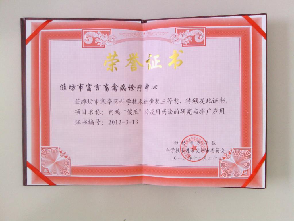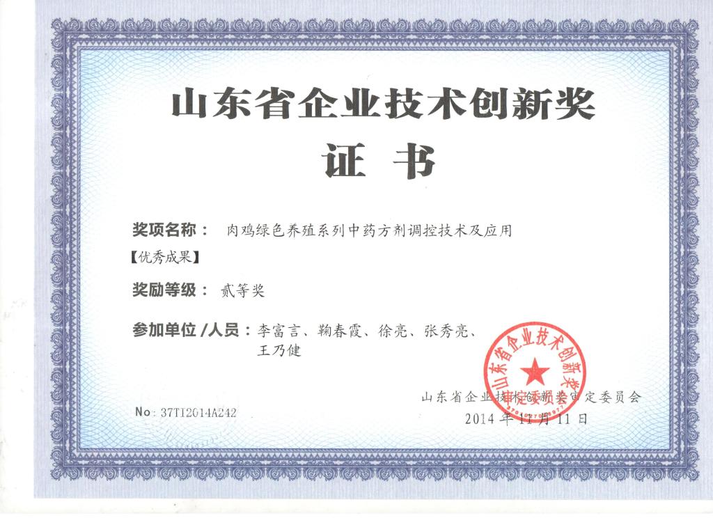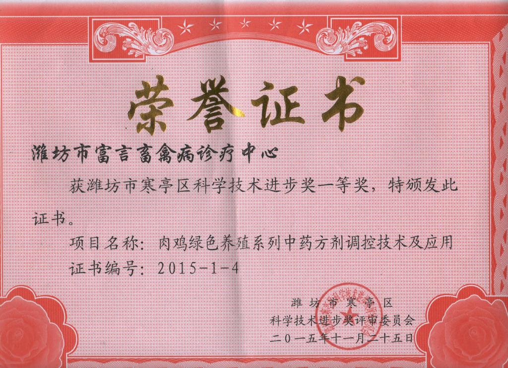 发明《肉鸡绿色养殖系列中药方剂调控技术及应用》显著提高肉鸡成活率,显著降低死亡率、显著降低料肉比。经国内专家鉴定,该研究达到了国内领先水平。显著降低死亡率、显著降低料肉比,科研项目《肉鸡绿色养殖系列中药方剂调控技术及应用》用于肉鸡养殖,给养殖业注入生机,此事迹被《大众日报》农村版连续多期跟踪报道,李富言院长被评为省级“优秀三农人物”。
